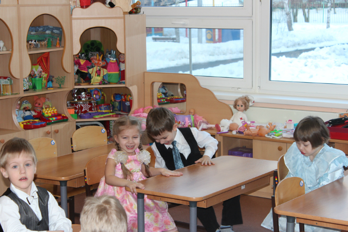 сидят дети, переодетые, чинно-благородно. Настя усидеть не может ни минуты. начинает стучать ножками под столом. на неё заглядывается мальчик, присоединятеся, через полминуты уже все дубасят.