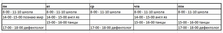 Были у невролога, Настю похвалили, разрешено (даже настойчиво рекомендовано) дочке умственные и физические дополнительные занятия. Поэтому Настино расписание выглядит так:
