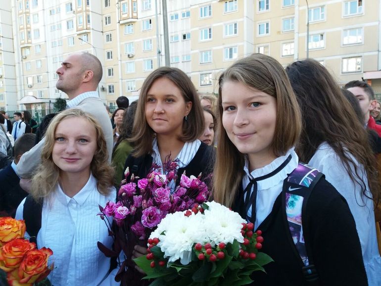 Мои дочки (теплое общее)старшая ушла раньше, у нее линейка в 9-00. мы с младшей пошли четко к 9 часам, я закинула Настюху в класс и метнулась на линейку к Кате. линейка на стадионе пришкольном.