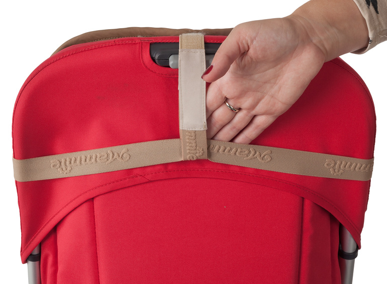 Крепится к коляске при помощи прорезей под пятиточечные ремни безопасности. Так же есть дополнительные крепления на завязках с четырёх сторон.