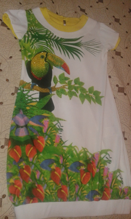 Очень красивое!!!! Мы с таким нетерпением стояли за ним в рядах в СП!!! На тукане стразики. Начали носить его в 8,5 лет. Сейчас нам 10,4 и если бы не пузико, то и этим летом носили бы(((( (Дочь всячески втягивала живот, не хотела отдавать)