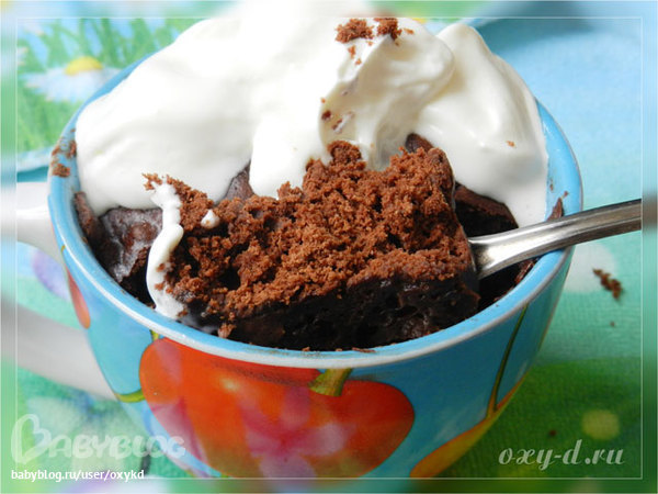 Этот десерт хорош, когда хочется чего-нибудь сладенького здесь и сейчас. Готовиться в микроволновке. Минимум усилий и прекрасный результат! Чудесный шоколадный вкус! Ешьте его теплым или холодным, но учтите, что чем больше кекс остывает, тем плотнее и тверже становится. Можно добавить в тесто орехи или изюм.