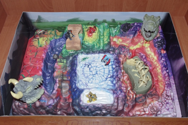 - чисто игровое поле с фигурками. Из "фокусов" только магнитная карта, которая своим прикосновением защелкивает ребра скелета и ломаем пополам мостик. Само поле из тонкого пластика (как у одноразовой посуды), но дополнительные детали и сами фигурки динозавров очень качественные.