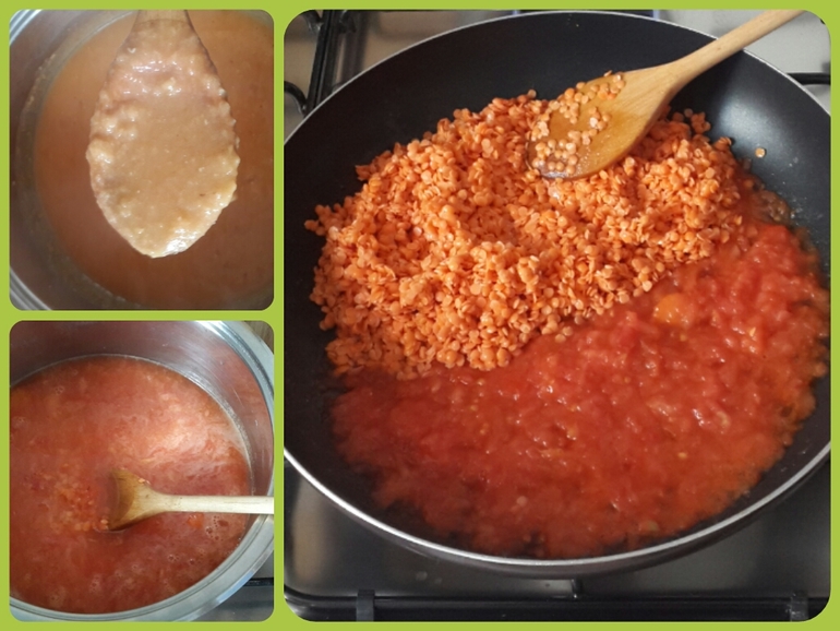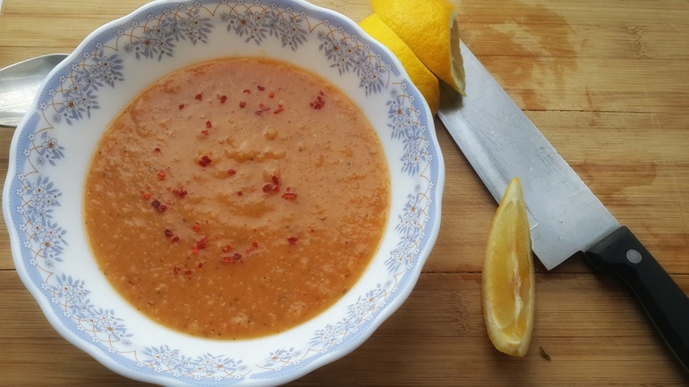 Помидоры потереть на терке, кожицу выкинуть, спассеровать с растительным маслом( у меня оливковое),добавить промытую чечевицу, прогреть.Переложит все в кастрюлю , залить водойна 2 пальца выше , сварить на медленном огне под крышкой.Довести до вкуса солью, белым перцем и паприкой, добавть хорошую щепотку мяты.Пробить блендером.Я не пробиваю до состояния крем-супа.Довести до кипения.Подавать горячим с долькой лимона и посыпав острым красным перцем.