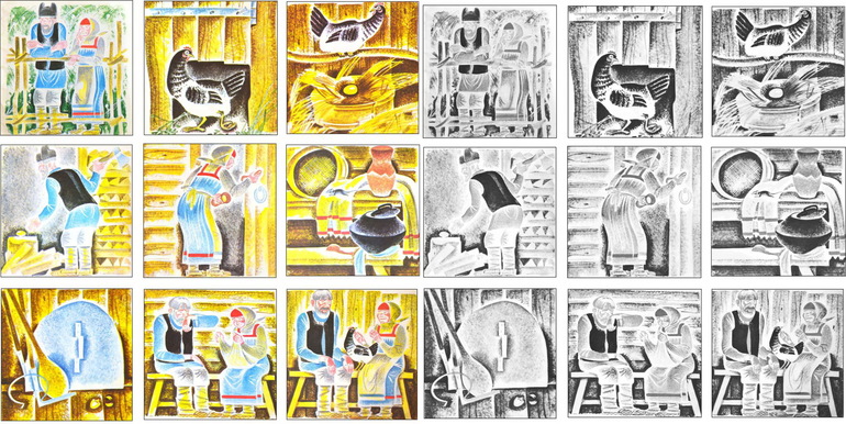 Принцип игры: выложить цепочкой цветные картинки на черно-белые и рассказать сказку по сюжету.
