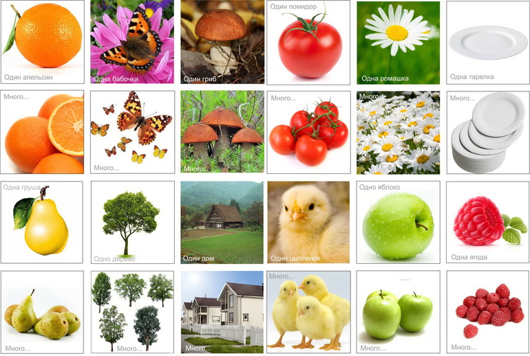 Тоже все просто. Деток помладше с помощью этих карточек знакомим с понятиями "один-много". Задача для деток постарше в плане развития речи - правильно организовать словосочетание. Например: "одно дерево - много деревьев", "один цыпленок - много цыплят" и т.д. Обращаем внимание именно на словообразование. кроме того по этим карточкам можно познакомить малышей с понятиями "мужской", "женский", "средний" род. И устроить сортировку по родам.