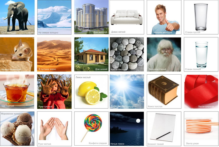 Цель игры - познакомиться в понятием "антоним" и подобрать противоположные по значению картинки. С детьми помладше просто подбираем, а для развития речи - задача малыша не просто показать картинку, но и проговорить то, что на ней нарисовано. Например: "чай горячий, мороженое холодное"; "днем светло, ночью темно" и т.д.