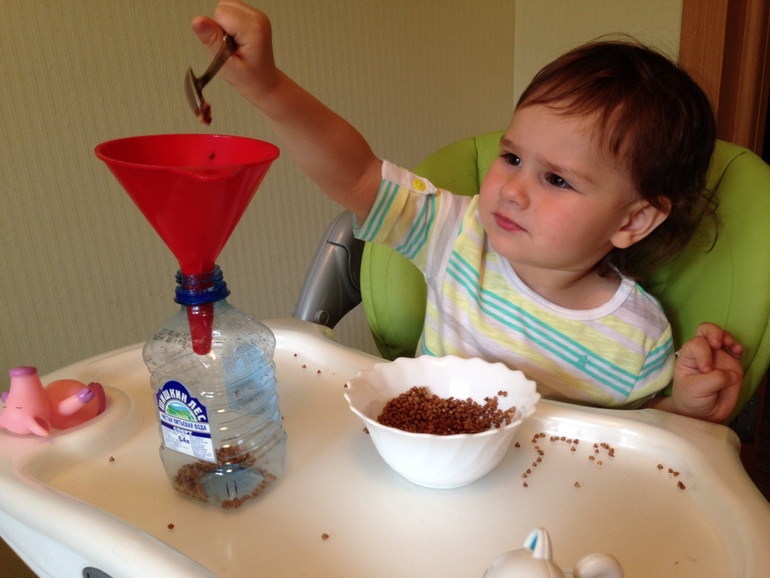 Потом Поля пересыпала гречку, разбирала фасоль и нут по разным плошкам, перекладывала все в бутылочку, пересыпала через воронку. Использовали ложки разных размеров, пытались вилкой. Когда надоело пересыпать, она просто взяла миску с остатками и перевернула ее аккуратно целиком во вторую:)