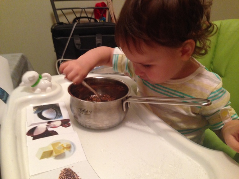 А вечером повторив еще раз про сороку-белобоку (это был хит сегодняшнего дня) стали варить кашу. По карточкам собрали ингредиенты, Полина сама положила в кастрюльку гречку, посахарила, налила воду и потом стоя на стуле мешала кашу на плите. Доварила конечно мама, потому как кулинар через минуту убежал играть в комнату))