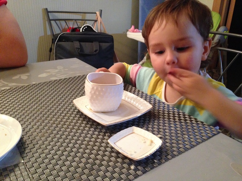 А вечером после ужина мы устроили чаепитие все вместе! Накрывали на стол вместе с Полей, заваривали чай, расставляли чашки. Пирожные Полине пока еще рано, она получила печенье и сушки, а чая выпила почти три чашки, очень довольная, что сидит не в своем стуле, а за общим столом))