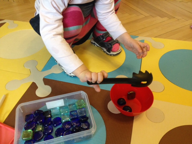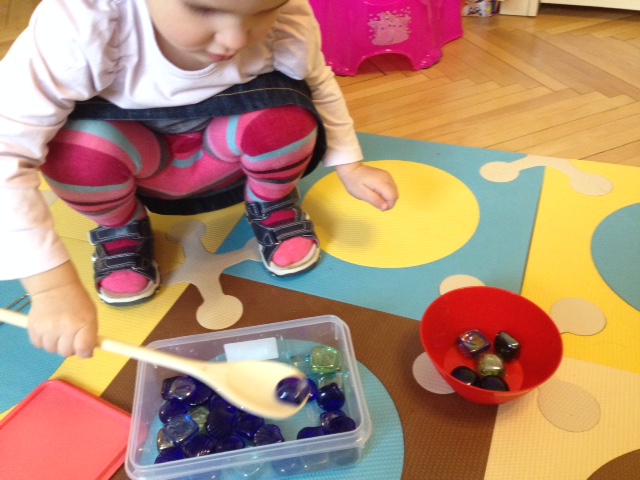 После завтрака сортировали кухонную утварь по материалам, потом взяли разных ложек-поварежек и пошли перекладывать ими разноцветные камушки. Не все инструменты дались легко)) а камушки мы еще и считали;)
