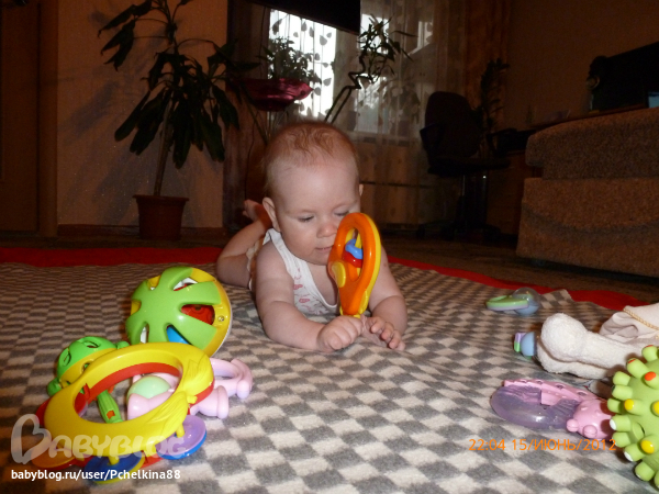 И мы со вчерашнего дня играемся на полу)))ему нравится)))я мимо прохожу,следит за мной))хоть можно оставить одного,а самой делать свои дела,подглядывая за ним)))а включу телик,дак вобще улыбается так клево)))