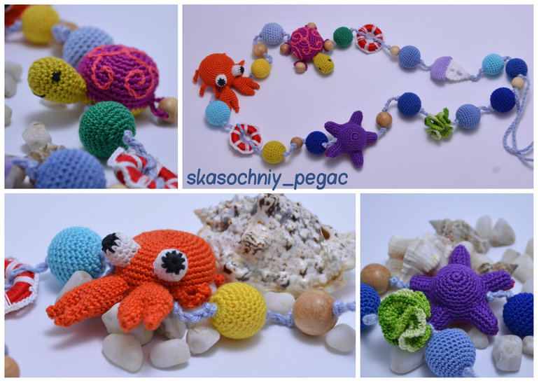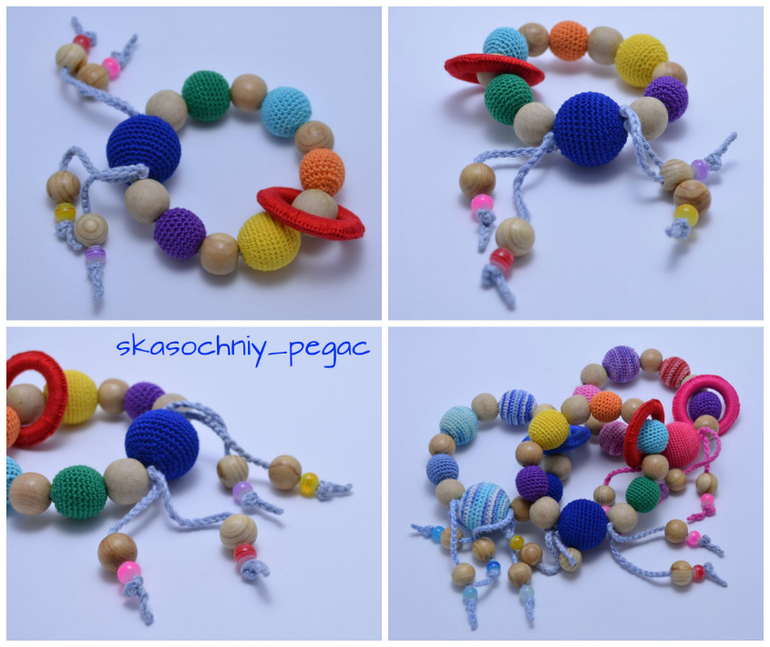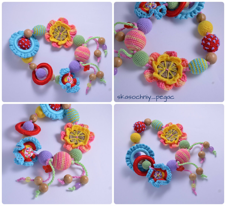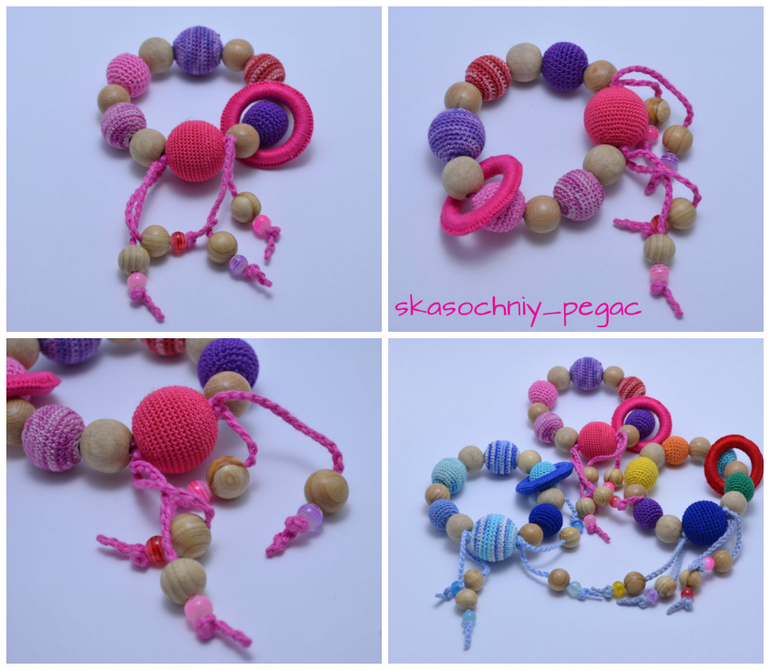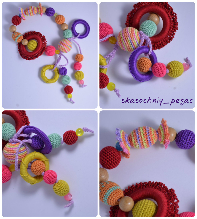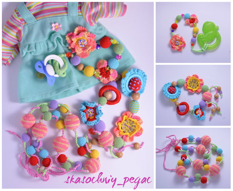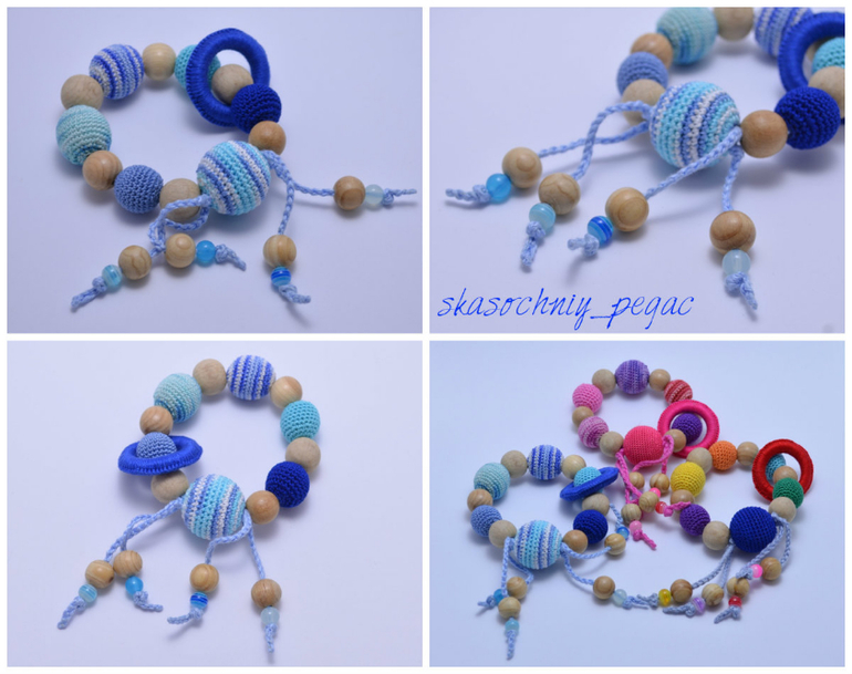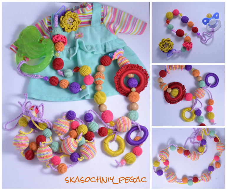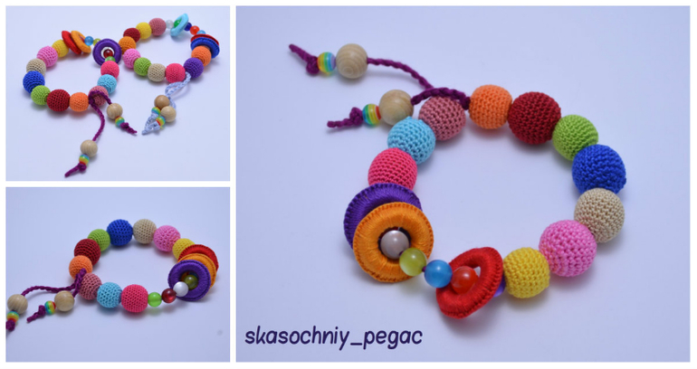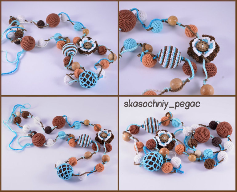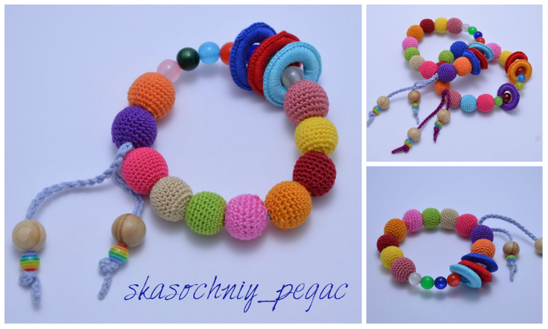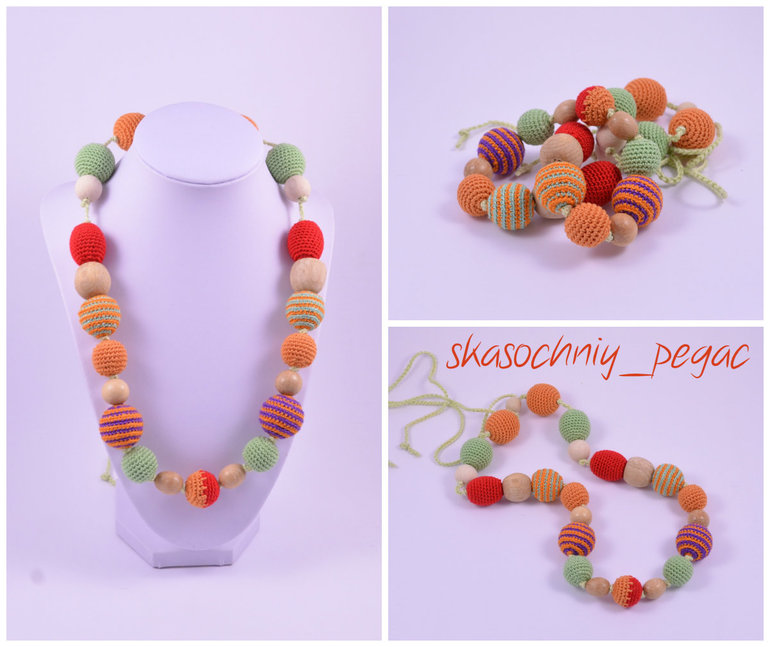 Длина 52см+шнурок, регулируются. Хлопок, буковые, можжевеловые и вишневые бусины. Можно грызть, стирать.