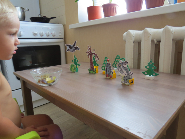 Тимоша с интересом наблюдал за событиями на столе, помогал мне вспомнить события сказки (в основном словесно), озвучивал героев сказки (очень радуют прогресс в развитии речи)))
