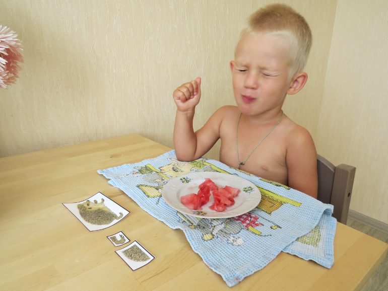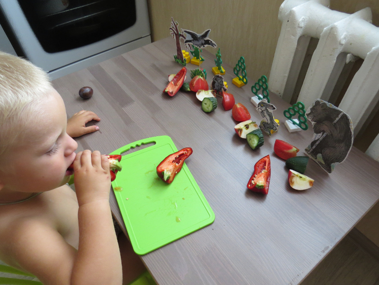 Потом предложила угостить зверей помидором, перцем, огурцом и сливой. Помидор быстро отдал медведю, огурец ежику, перец вороне, сливу оставил себе) Уговорила разрезать и дать каждому по кусочку. Тимоша как истинный повар попробовал чем же кормит гостей.