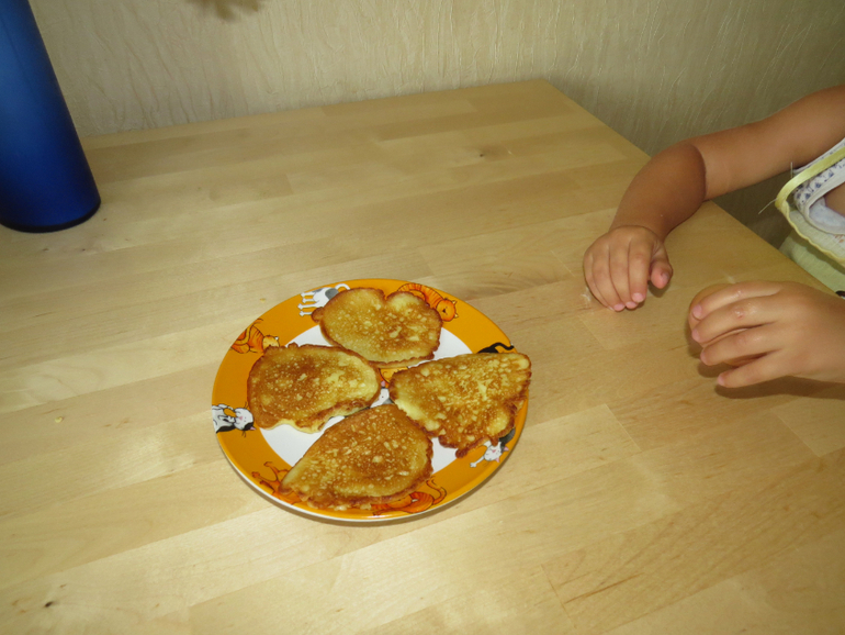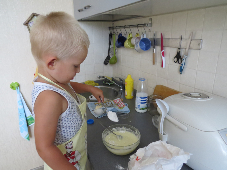 Поскольку в отсутствие папы мы частенько гостим у бабушки, готовим дома мало и на один раз, решено было приготовить не пирог, а блинчики с яблоками. Тимоша помогал мыть и тереть яблоки, насыпал сахар и муку