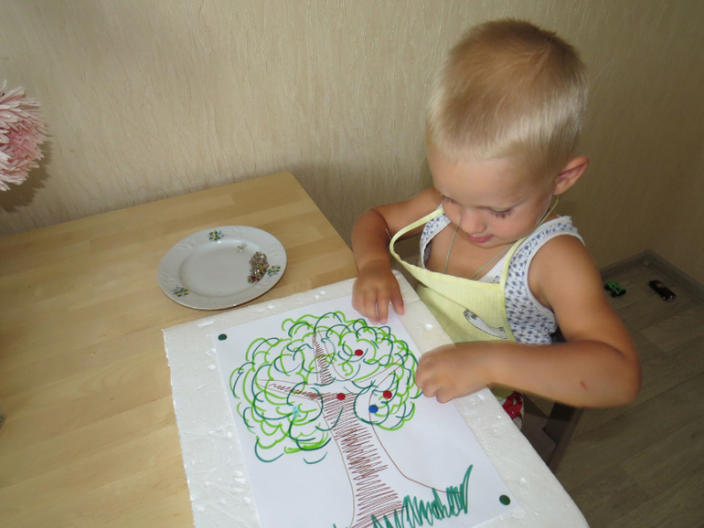 пока жарились блинчики, занялся кнопками, ух и помучился он с ними, чуть было не бросил, шляпки тонкие, округлые, ну никак ему не поддавались, потом вроде бы приноровился. проговорили какого цвета бывают яблоки, но все равно Тимоша вставлял синие кнопки и хитро улыбался)