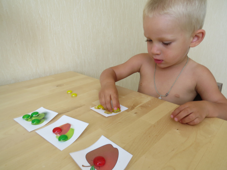 распечатала поле для лото в одном экземпляре, поэтому пришлось менять задание. считали яблоки на картинках и раскладывали соответствующее количество камушек по цвету