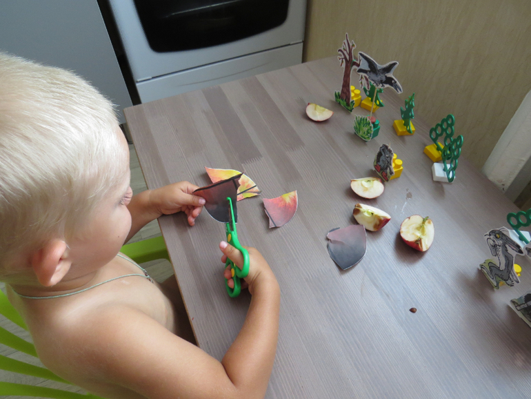 Дольше мы потренировались в разрезании яблока ножницами. Сам режет и говорит "Пополам, еще раз пополам"