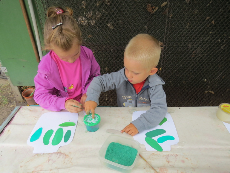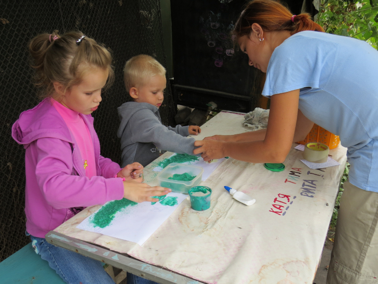 делали аппликацию солью, листву разукрашивали пальчиками и приклеивали цветок из салфетки (жалко, но я не сфотографировала конечный результат)