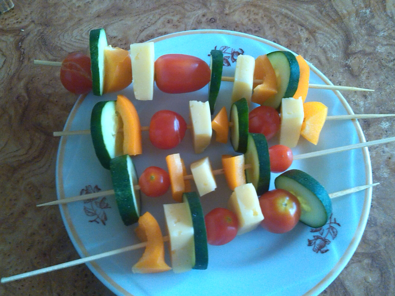 Лучше всего детвора ест огурцы и помидоры, сорванные только что с куста, поэтому блюдо у нас простое, но очень полезное и вкусное. Ребята сорвали и помыли овощи, я порезала на кусочки и мы сделали шашлычки.