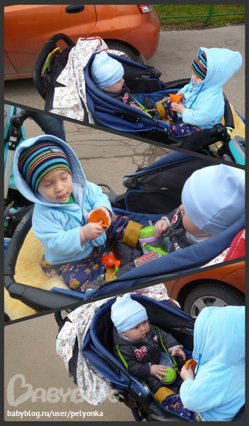 Вылезли на полуторачасовую прогулку с нашим другом Валентином и его мамочкой Юлей)) Поздоровались по-мужски - нежно пожамкали друг другу ручки)) Обменялись игрушками) Ездили в колясках стоя)) Через какое-то время Ярик пришел переполз в гости к Вале))