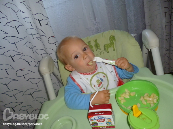 Кушал самостоятельно крупные макарошки вилкой. Первый раз попробовали макарошки, как-то забыли про них совсем))) А вилкой до этого ковыряли только нектаринку, и то с маминой помощью.
