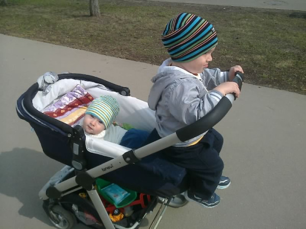 Итаааак… Гешке уже 6 и три дня. Будет мне и моим заплывшим пролактином мозгам урок на будущее: вот что значит неверно выбрать форму изложения… И этот милый мальчишка совершенно перестал спать на прогулке, надо б избавляться от люльки. Так как выходим мы гулять самые первые, по-моему, примерно в 10.30-11, и еще не успевает раскочегариться, то к тихому часу у нас оказывается куча лишних теплых вещей, надоевших игрушек и любопытных находок. Гермашка висит на мне, кушает и глазеет, Яренька играет на площадке, люлька превращается в корзину для ненужных вещей/пеленальный столик и иногда – средством транспортировки уставшего Ярика. Прохожих очень забавляет, конечно, эта картина: практически двухлетка в младенчиковой люльке. АГУ!))