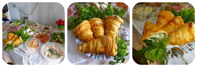 Только еще один малюсенький хваст напоследок. Вот как мы с мамой, бабулей и маленькой Наташкой накрыли фуршетный стол на мой ДР!))) Я командовала, а они все делали, любимки мои)) Гешка спал на балконе, а папа выгуливал Ярика. А что же делала я? МОРКОВКУ! По вот этому чудесному рецепту. Только начинку сделала Яриковаримую – салат без вредностей, заправленный несладким йогуртом. Первый раз имела дело со слоеным тестом. Короче, довольна собой как слон))