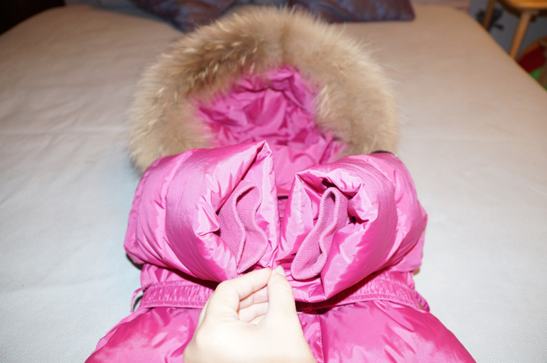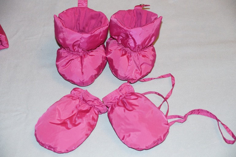 Стирала один раз перед продажей в машинке на режиме ручной стирки. Пух нигде не свалялся. В комплекте пинетки и варежки (без пальчиков, как антицарапки). Мех пушистый.