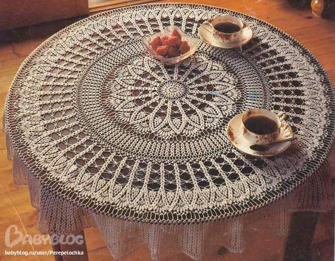 ой, класс! Я сама сейчас заканчиваю вязать круглую скатерть( только спицами) так я выбрала себе такой приятный синий цвет... если положить такую скатерть на белую или бежевую ткань, то будет очень хорошо смотреться ) http://knitka.ru/877/skatert-floks.html как тут, только я сделала наоборот)) а то все дома белое и бежевое )