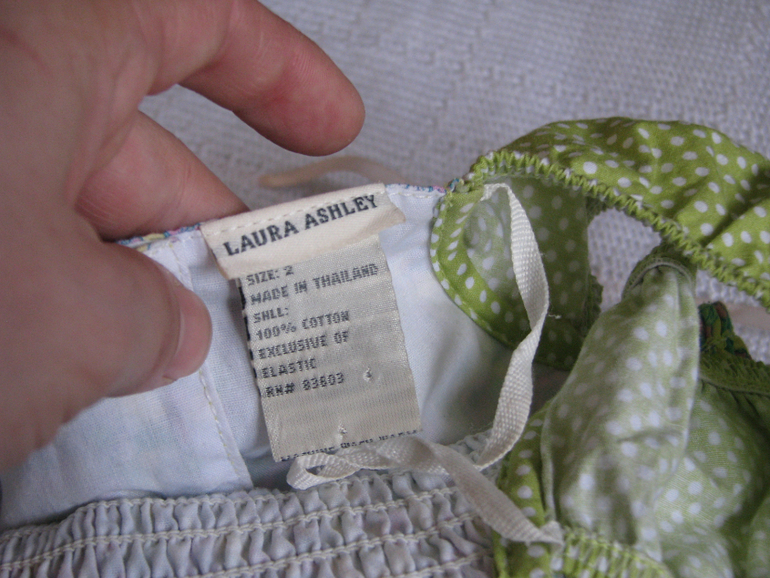 2, Платье Laura Ashley на 2 года, но мы носили и в 3 года - просто платье не до пола получается в 3 года, а до колен, но за счет прошитых резинок на груди - она не стесняет спинку. Платье из хлорка, внутри подкладка.