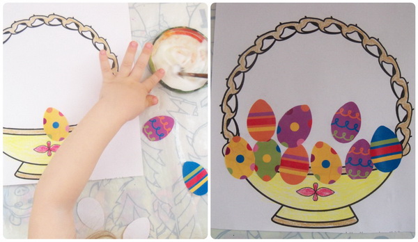 Сначала я немного рассказала дочке о празднике, очень кратко, своими словами (не уверена, что она поняла все). Затем мы принялись "красить" яички - аппликация пластилином, ватой, цветной манкой, конфетти.