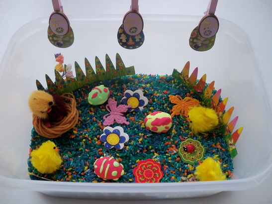 Весенне-пасхальная сенсорная коробочка. Снимали/одевали прищепки, подбирали по цвету, играли с птичкой и цыплятами, Ксюша прятала ручки в крупе (цветной рис).