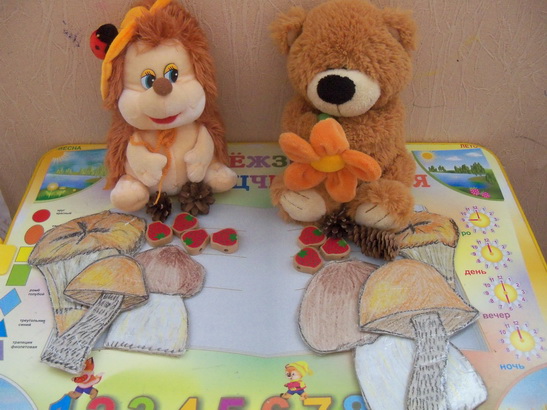 Затем угостили ежика и мишку. Я дочке говорила, что давать и сколько, она сама считала. Грибы давали по названиям - маленький подберезовик, большую лисичку и т.д.