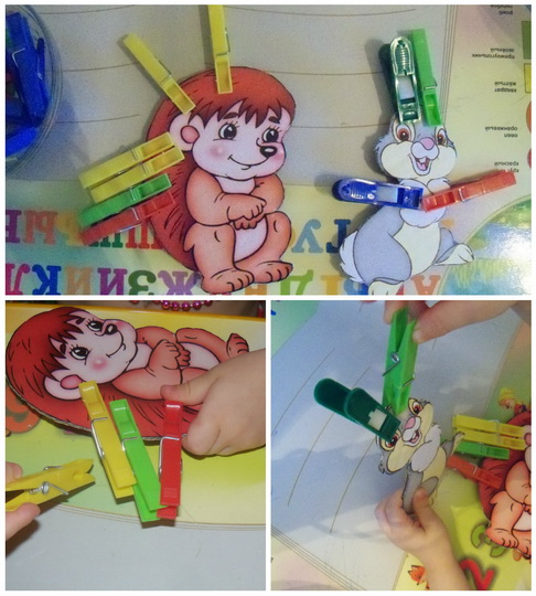 1. Играли с прищепками - ёжику добавили колючки, а зайчику сделали ушки и лапки. Ксюша все делала сама.