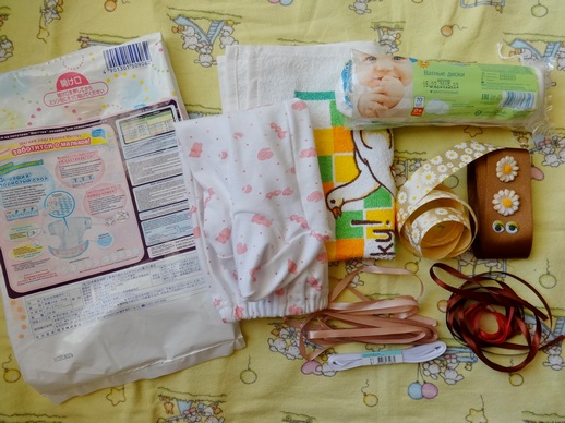 Сначала необходимо приготовить пачку подгузников (у меня было 24 шт, но можно и больше; размер взяла не самый маленький - с запасом), полотенце и ватные диски (без этого можно обойтись - заменить подгузниками, если большая пачка), ползунки, глазки, всевозможные ленты - шириной 5 см, 2,5 см, 1,2 см, 0,6 см (на фото ниже лент мало, в процессе изготовления докупила еще несколько разных). А также использовала горячий клей (клеевой пистолет) и зажигалку или свечку, чтобы обработать срезы всех лент.