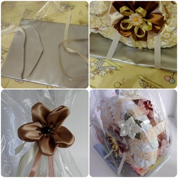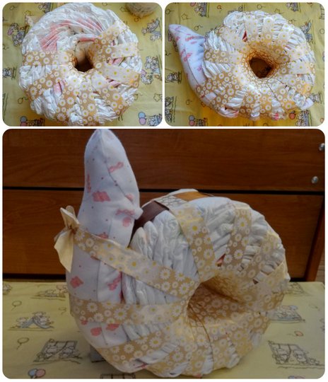 Сделала тело улитки - в ползунки (в одну "штанинку") положила ватные диски и свёрнутое полотенце (если большая пачка подгузников, то можно всё сделать из них). Затем приложила получившееся тело к "домику" из подгузников и сделала оставшиеся 3 витка ленты. Конец ленты закрепила каплей клея. Для устойчивости оставшимся кусочком ленты (длиной около 60 см) привязала улитку к подгузникам, сделав впереди бантик.