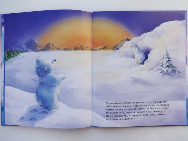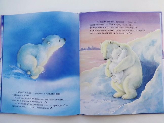 "Как медвежонок солнце искал" - это прежде всего книжка-картинка для малышей. Но пройти мимо нее было невозможно, поэтому тоже взяли домой. И не зря - получили море удовольствия от рассматривания картинок - все такое милое, теплое, нежное (несмотря на то, что пейзажи - одни льды и снега). Очень уютная книжка, смысл прост - как хорошо вернуться к маме, когда ты потерялся. Читали\смотрели несколько раз. Я не собиралась ее покупать, но после прочтения очень захотелось, до сих пор не отказалась от этой мысли (хотя, повторюсь, книга года на 2-3). Минус в том, что текст на цветном фоне, но читает все равно взрослый.