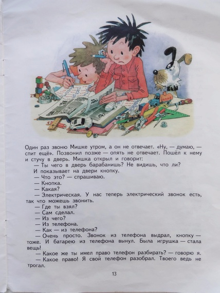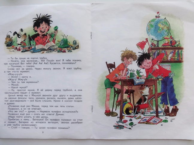 Прочли несколько тонких книг. В первую очередь запомнился "Телефон" Носова с илл. Огородникова. Сам рассказ в представлении не нуждается, а с такими иллюстрациями книжка получилась очень здоровская! Как всегда у Огородникова обилие мелких деталей, которые можно рассматривать очень долго. И запоминающиеся собаки-кошки. С удовольствием бы купила переиздание. К слову, я брала в библиотеке еще и большой сборник рассказов Носова (он и сейчас продается, такой синий), Ксюше очень понравились многие рассказы (хотя некоторые еще рановато читать), надо обязательно купить такой домой.