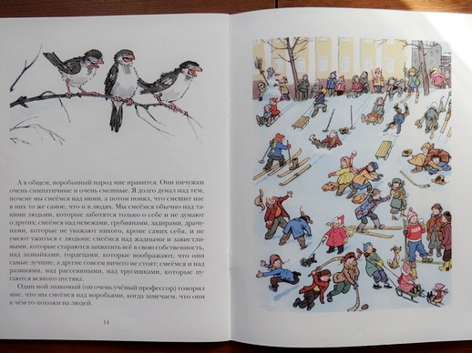 Тоже прочли один раз. Честно говоря, я просто уговорила дочку дослушать до конца. Рассказ показался скучным даже мне (при всем моем уважении к Носову и любви к его рассказам). Здесь нет никаких событий, которые могли бы заинтересовать дочку, есть только наблюдение за воробьями. Возможно, не в том возрасте надо читать. К слову, другие рассказы Носова (событийные, поучительные) Ксюша слушает с удовольствием. Единственное - мы долго рассматривали последнюю иллюстрацию с ребятами на горке, дочка просила про них прочитать. Но, увы, автор просто сравнил воробьев с детьми, а художник так это показал, так что читать про них было нечего.