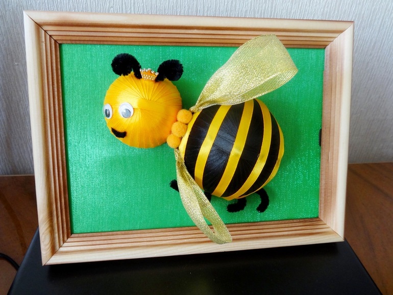 РукоделиеРодительский комитет нашей группы в детском саду каждому работнику на выпускном вечере вручал символическую рамку, оформленную своими руками. К примеру, у завхоза в рамке были замок и ключи, у физрука - скакалка. Меня попросили оформить рамку для заведующей - сделать пчелку-королеву (символ трудоголизма трудолюбия и главенства). Вот что у меня получилось.
