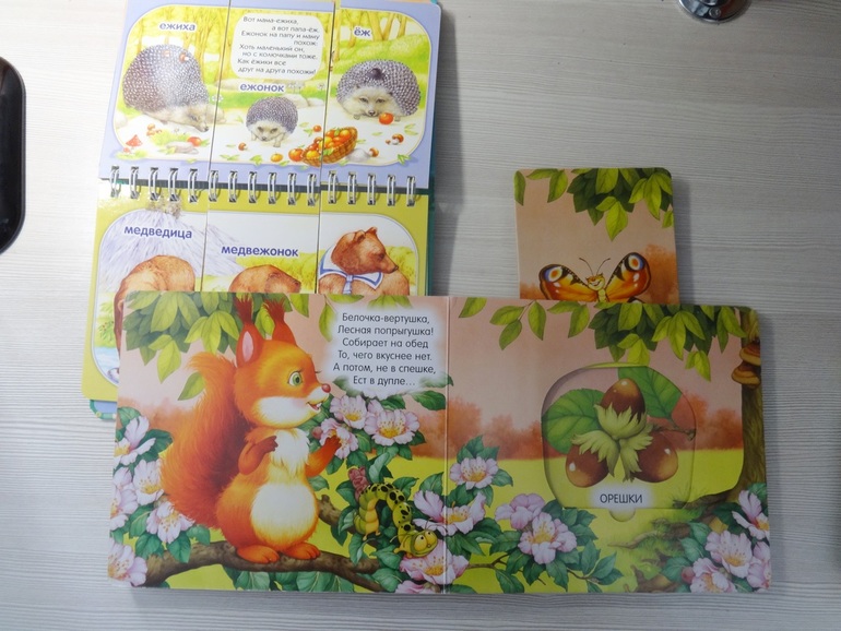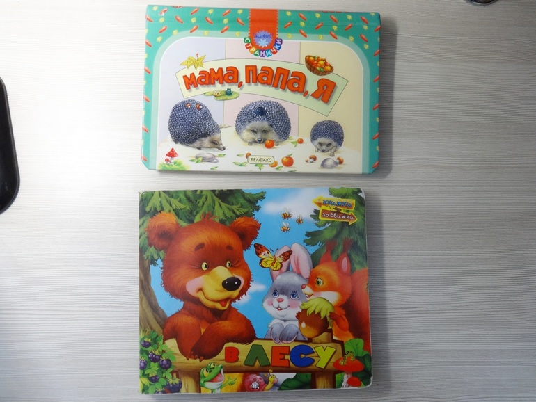 Тоже Ксюшины книжки. Их обычно Костик смотрит сам, листает, открывает, слушать стихи не хочет. Они скорее как игрушки для него, но достает постоянно. В первой чаще ищет ежиков )), хотя семейки не собирает.