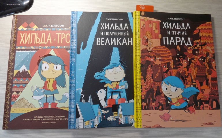 Книжная полочкаКсюша читает медленно и вообще не любит это дело. Даже послушать мое чтение надо уговаривать. Подруга посоветовала попробовать комиксы предложить, в общем-то идея оказалась неплохой. Я решила купить нашумевшие комиксы про Хильду. Первые две книги сначала читала дочке я, она сидела рядом и рассматривала картинки. Потом Ксюша все-таки взялась их перечитывать сама. Ура! Когда она читала вторую, я заказала третью. Ее Ксюша читает полностью сама. Теперь ждем скидок, чтобы заказать оставшиеся две )).