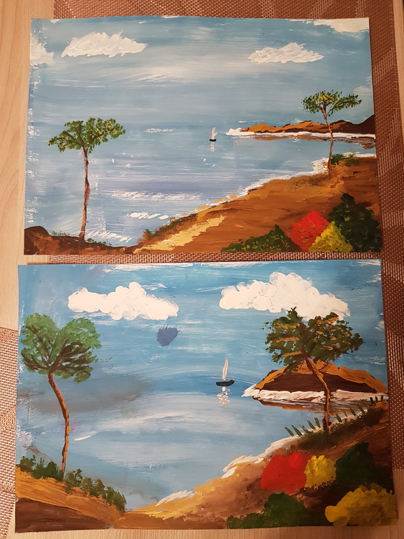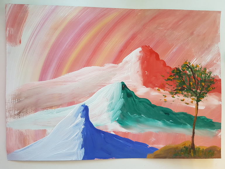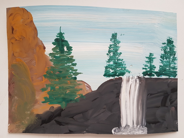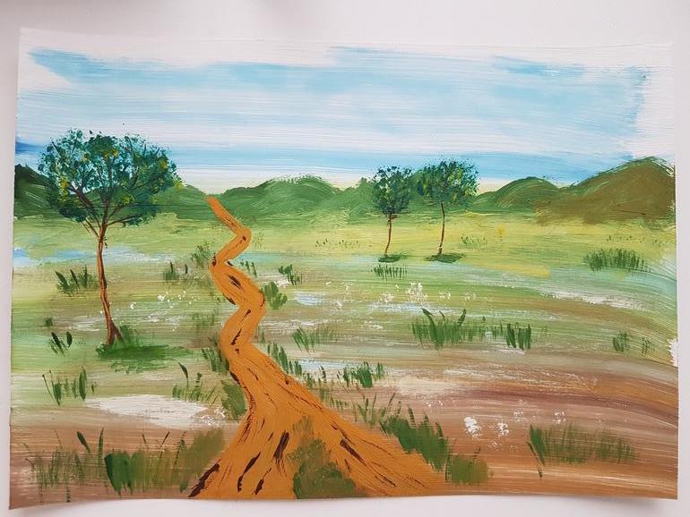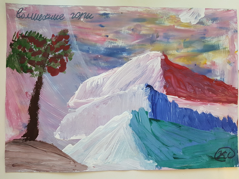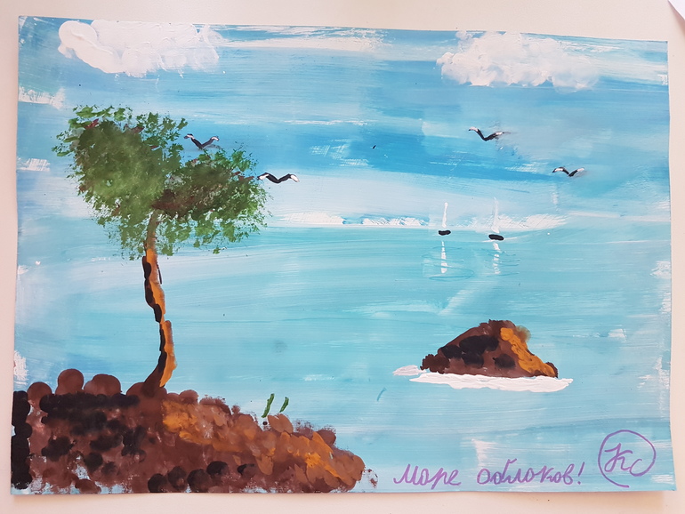 Дочка моя, увы, тоже не художник, в свои 9 лет она рисует как лет в 5. У нее не получается почти ничего. Поэтому я предложила ей рисовать вместе, и она периодически ко мне присоединялась. Ниже ее первый пейзаж.