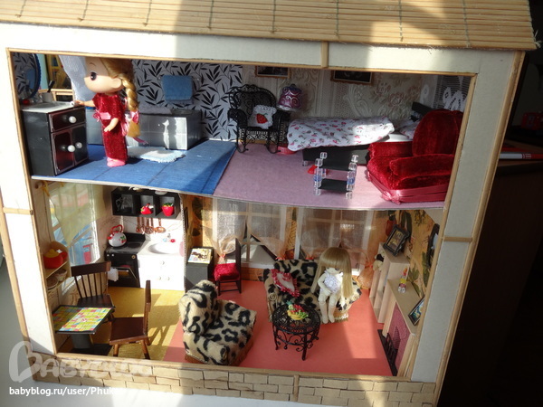 Хобби, своими рукамиВот на что сгодилась старая коробка. Использовала остатки напольного покрытия, линейки, старую одежду, бусы. Мебель тоже сделана мною( кроме стульев на кухне и металлического кресла) На все ушло 2 недели новогодних каникул. Раньше ничего подобного не делала, но в процессе испытала массу положительных эмоций. Кстати, куклы 11 см роста. Выскажите свое мнение!