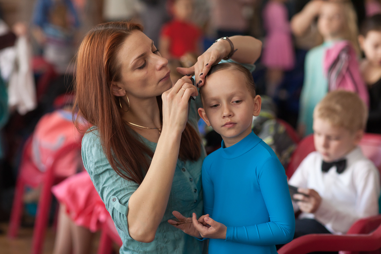 серьезная подготовка :) тренера сами сделали нам прически, как взрослым )) гели-лаки-сеточки :) Детям такое внимание тоже было очень приятно :) Правда, Алиса немного боялась шпилек ))))) зато потом до конца дня хотела ходить с прической.
