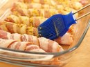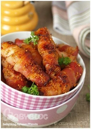 Так как готовка занимает 5 сек, то заранее включите духовку на 220 оС. Мясо нарезать полосками по длине грудки, толщиной с палец. Плотно обмотать каждую полоску беконом. Выложить полоски в форму для запекания (смазывать форму не нужно). Смешать мед, горчицу и лимонный сок (можно поперчить). И смазать этой смесью каждую завитушку. Отправить в духовку и запечь до полного зарумянивания.