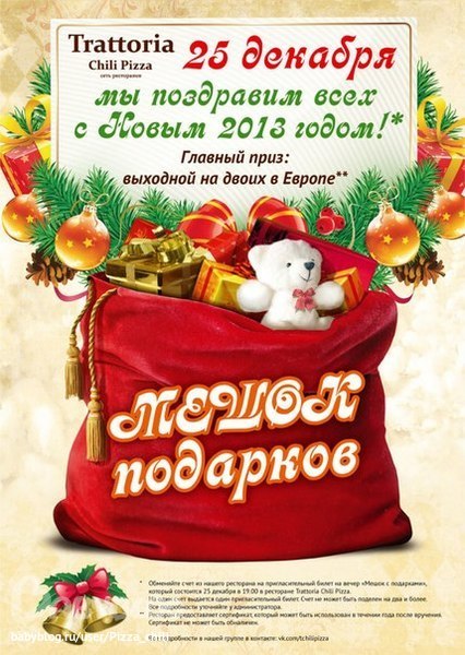 Уважаемые гости нашего ресторана, рады сообщить Вам что у нас в ресторане в период с 1 по 24 декабря проходит лотерея! 25 декабря мы будем производить ее розыгрыш - главный приз - поездка на двоих в Европу! Приходите к нам в гости - и возможно именно Вы станете счастливым обладателем главного приза!
