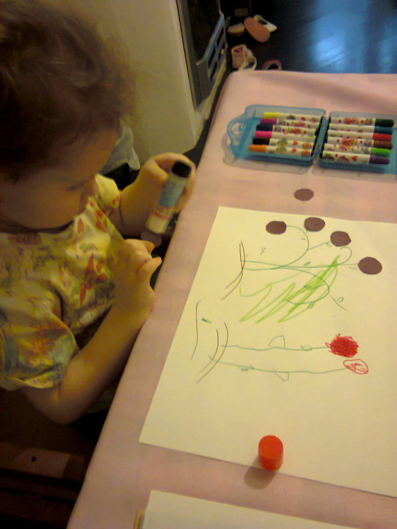 Под стишок весело пособирали ягоды: дочь - землянику свою любимую, маме досталась черника, которую потом мы использовали для аппликации (как раз этот процесс на фото. Тут еще Василиса применила новый для себя метод намазывания клеем на весу :))